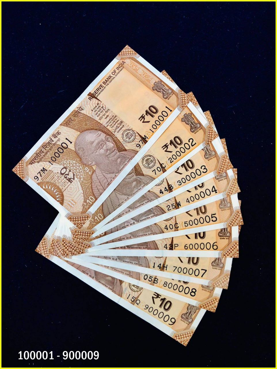 Semi fancy numbers 9 notes set from 100001 to 900009 Also called as mirror no’s like (100 mirror effect is 001).