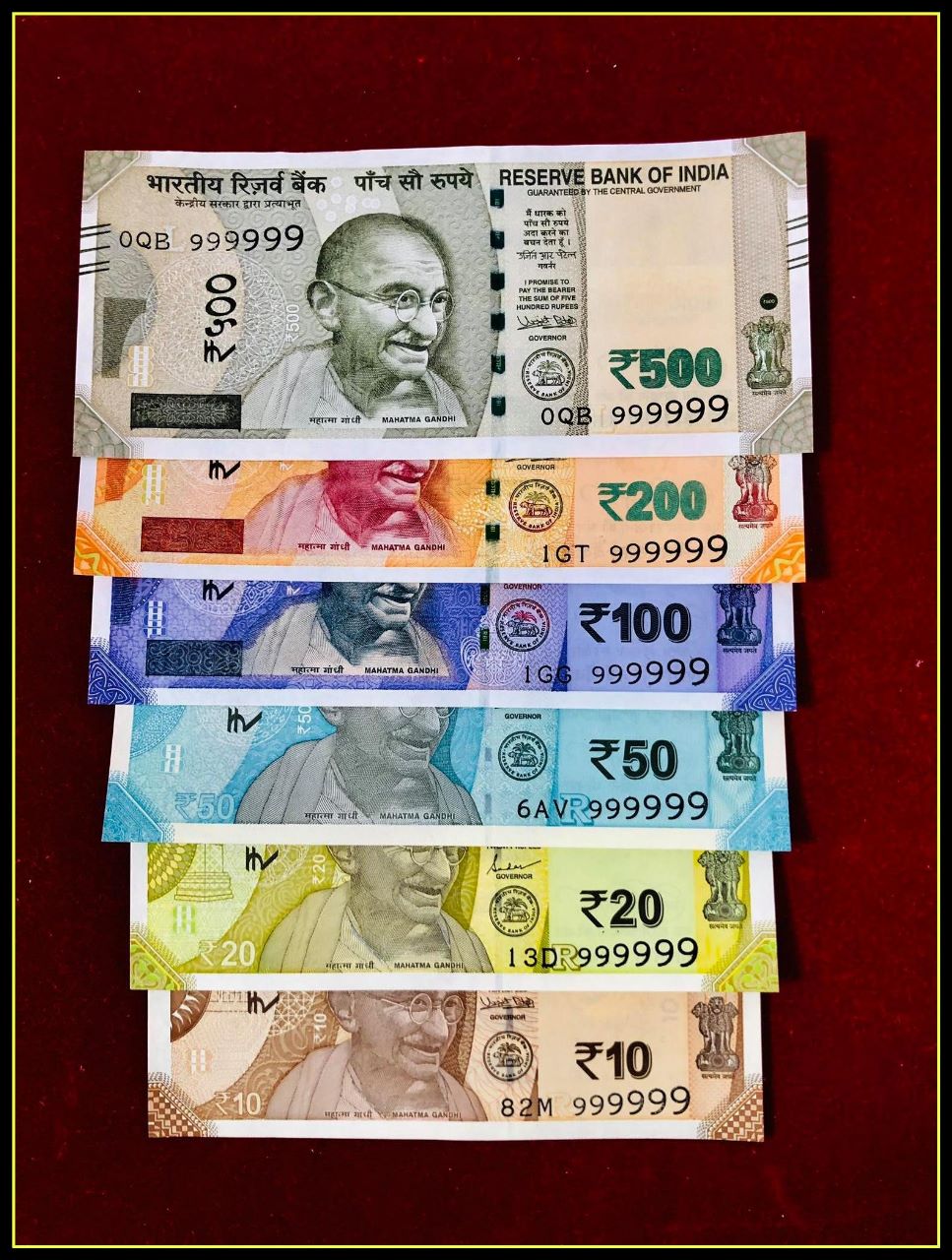 Solid fancy numbers 999999 GEM UNC 9 notes set no. 9 is consideres to be auspicious & very lucky.1 can find maximum car numbers totalling comes to 0.which get sold at a premium.