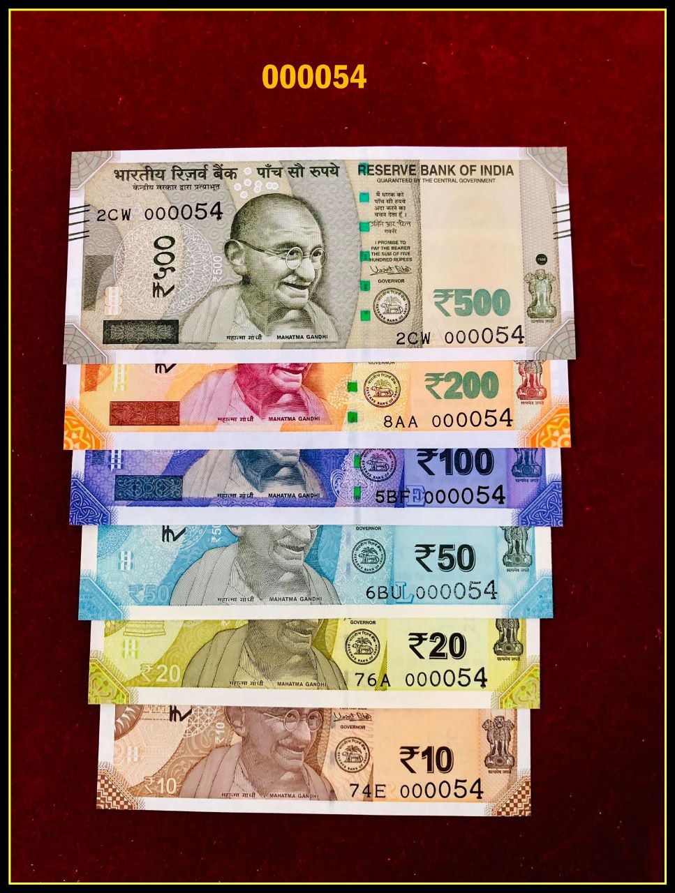 Low digit numbers 000054 GEM UNC,Now get last 2 digits as your lucky number with 6 notes set from 10 Rs to 500 .