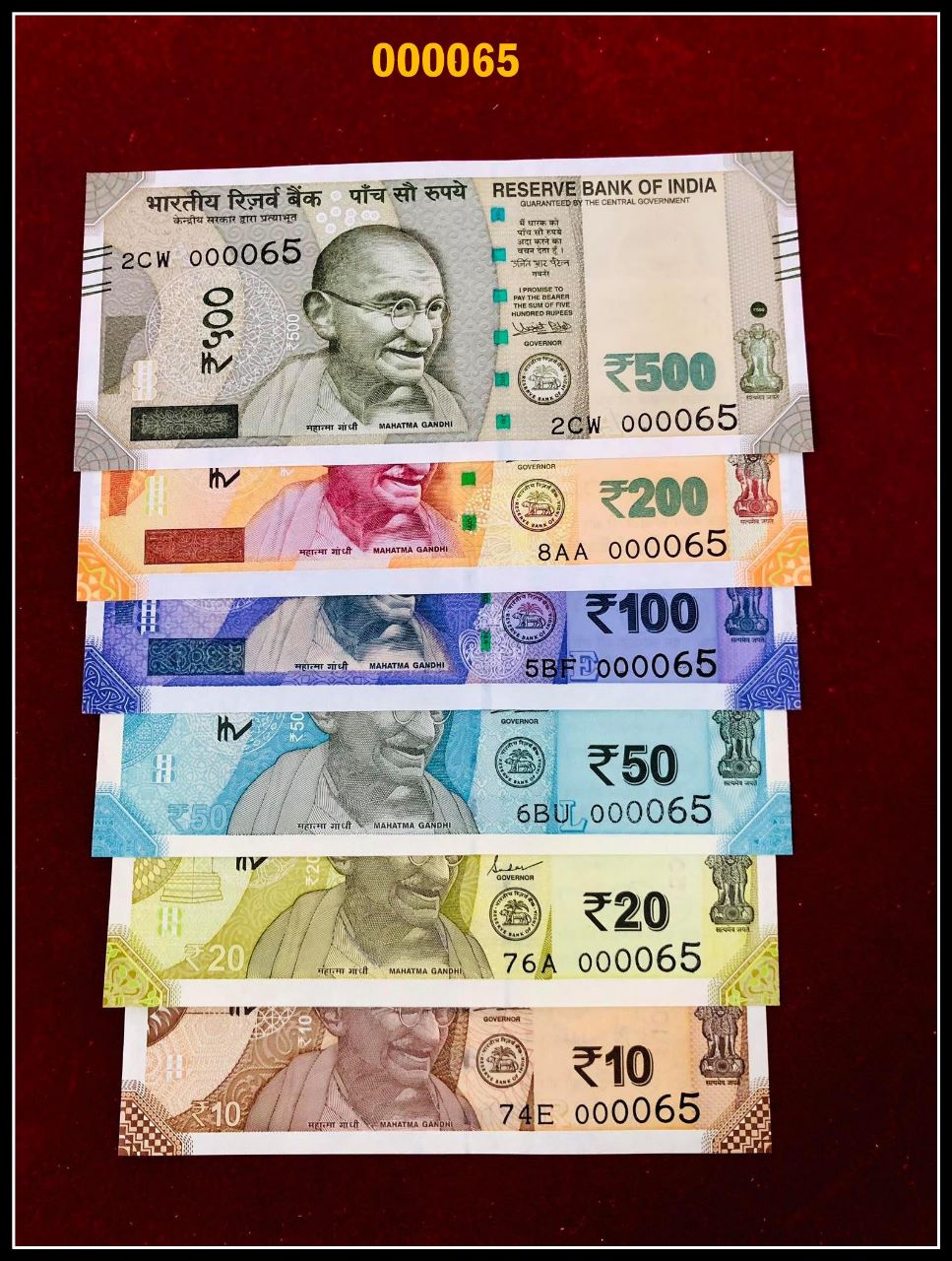 Low digit numbers 000065 GEM UNC,Now get last 2 digits as your lucky number with 6 notes set from 10 Rs to 500 Rs.