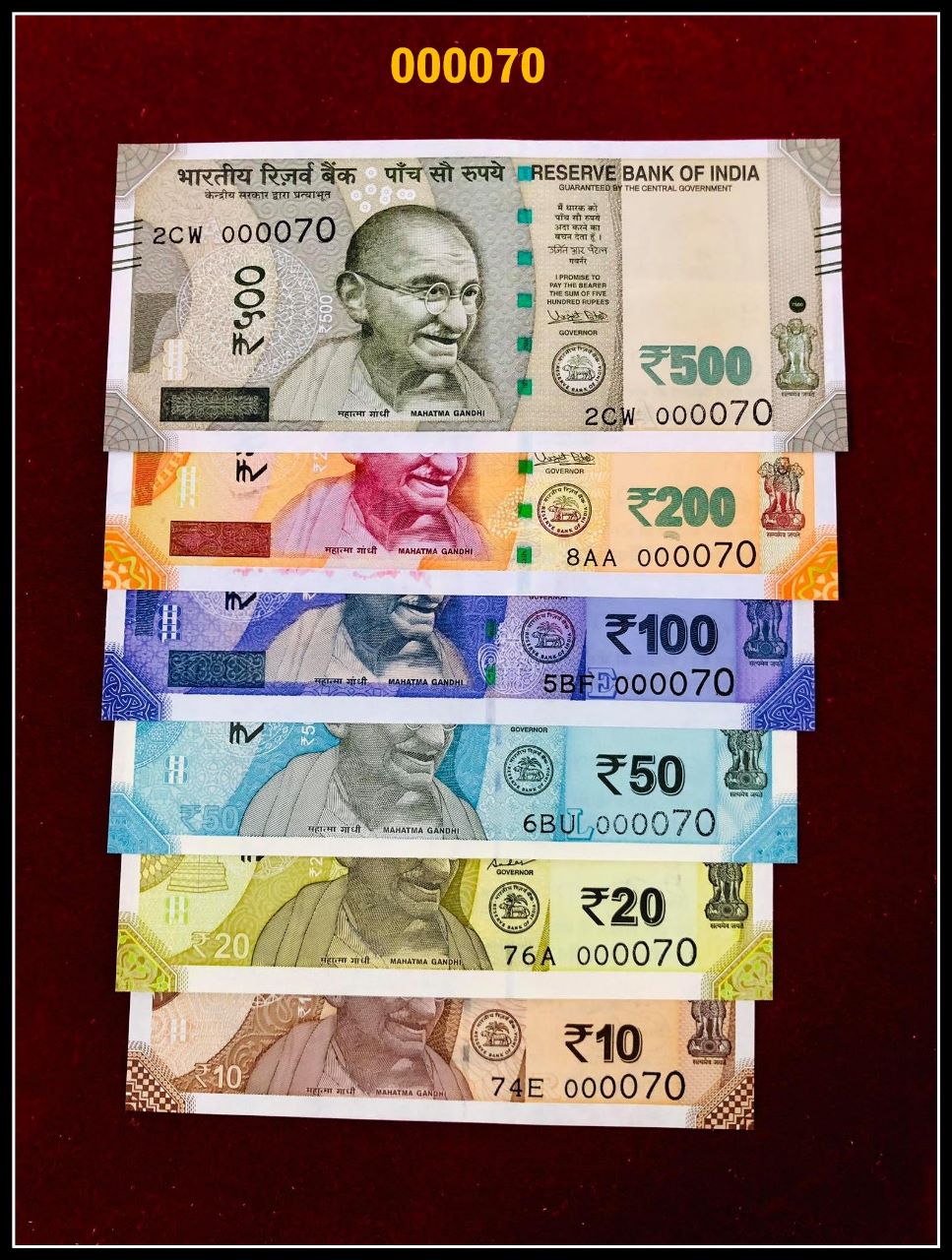 Low digit numbers 000070 GEM UNC,Now get last 2 digits as your lucky number with 6 notes set from 10 Rs to 500 Rs.