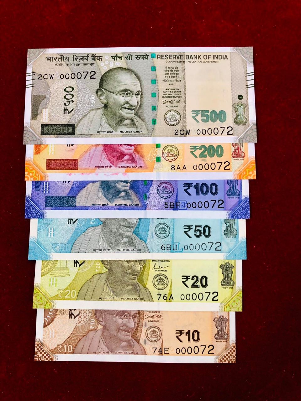 Low digit numbers 000072 GEM UNC,Now get last 2 digits as your lucky number with 6 notes set from 10 Rs to 500 Rs.