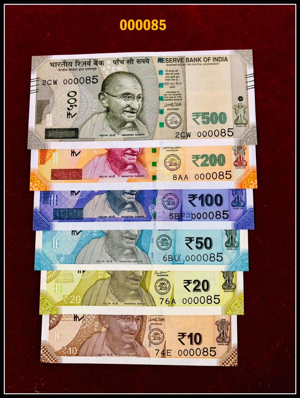 Low digit numbers 000085 GEM UNC,Now get last 2 digits as your lucky number with 6 notes set from 10 Rs to 500 Rs.