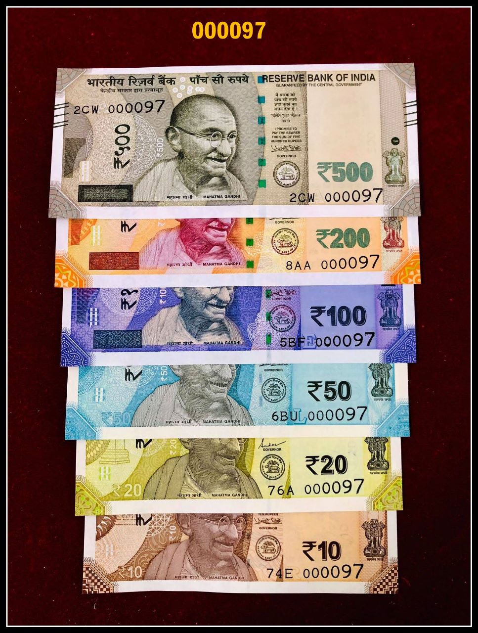 Low digit numbers 000097 GEM UNC,Now get last 2 digits as your lucky number with 6 notes set from 10 Rs to 500 Rs.