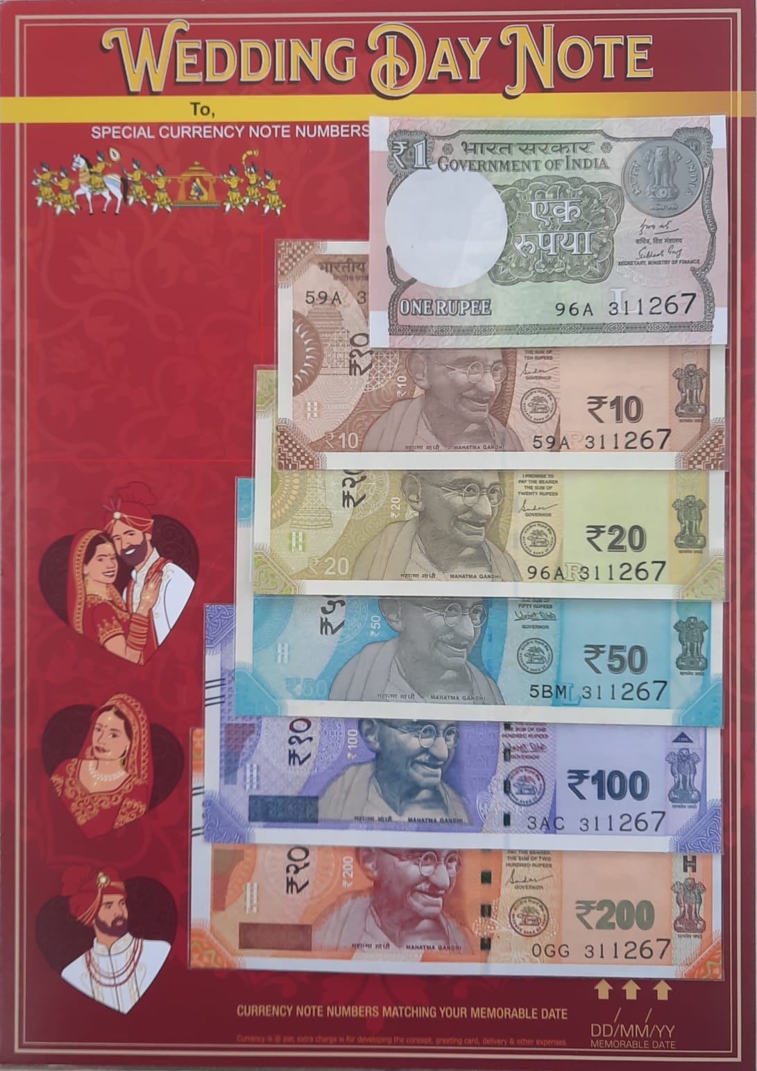 1 Rs(New),10 Rs to 200 Rs wedding date with currency note numbers matching your memorable dates in DDMMYY formet.Economical & affordable unique gift..whichas valuefor money.