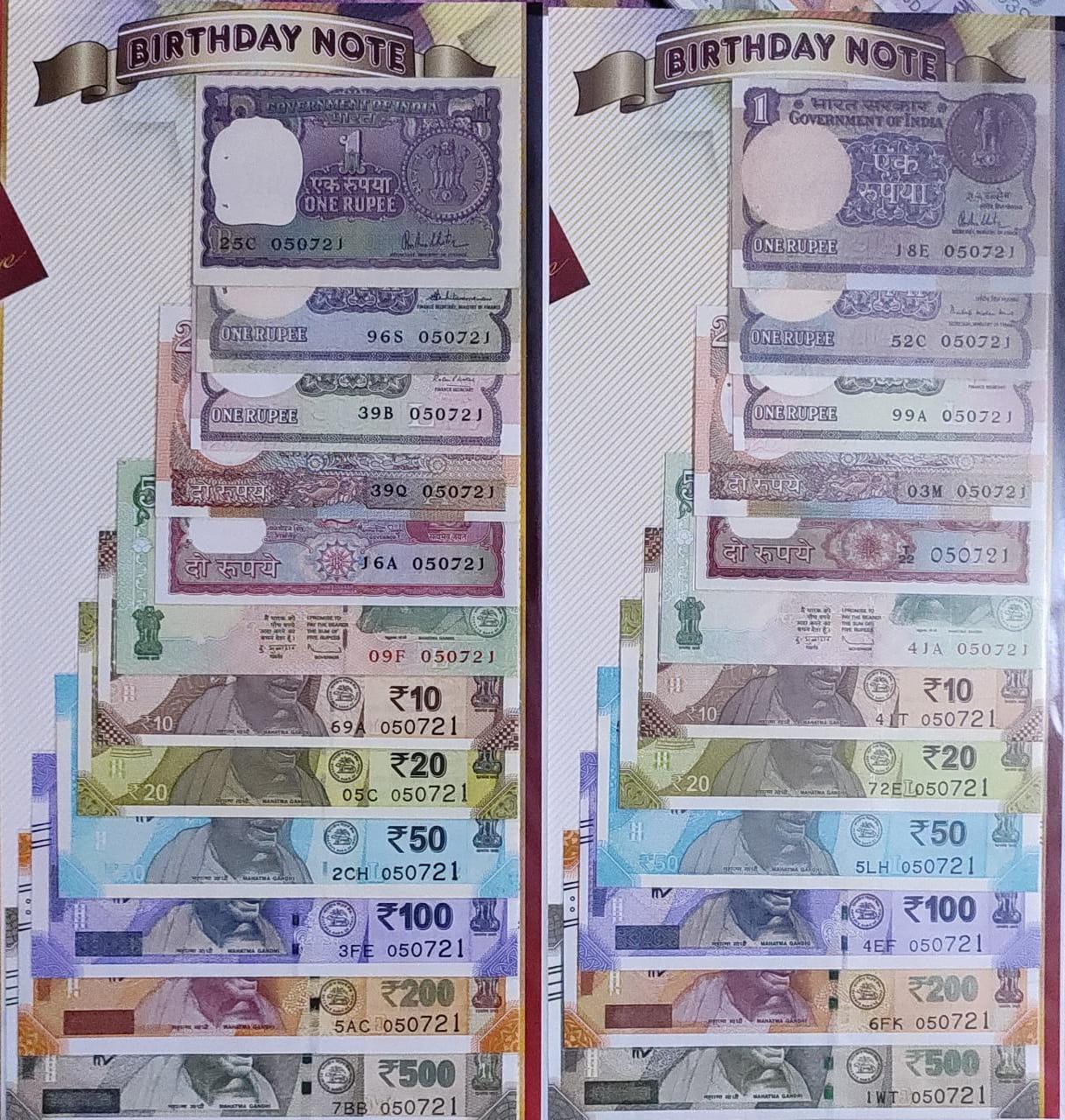1 Rs(new printed between 2015 to 2020),1 Rs old (small coin printed between 1981 to 1994),1 Rs old (big coin printed between 1951 to 1981),2 Rs( satellite design),2 Rs( tiger design),5 Rs,10 Rs,20 Rs,50 Rs,100 Rs,200 Rs,500 Rs birthdate with currency note numbers matching your memorable d dates in DDMMYY format.Same numbers in both the sets total 24 notes.For ultimate person. All possible denominations avilable in market. it’s truly for a different class of person.