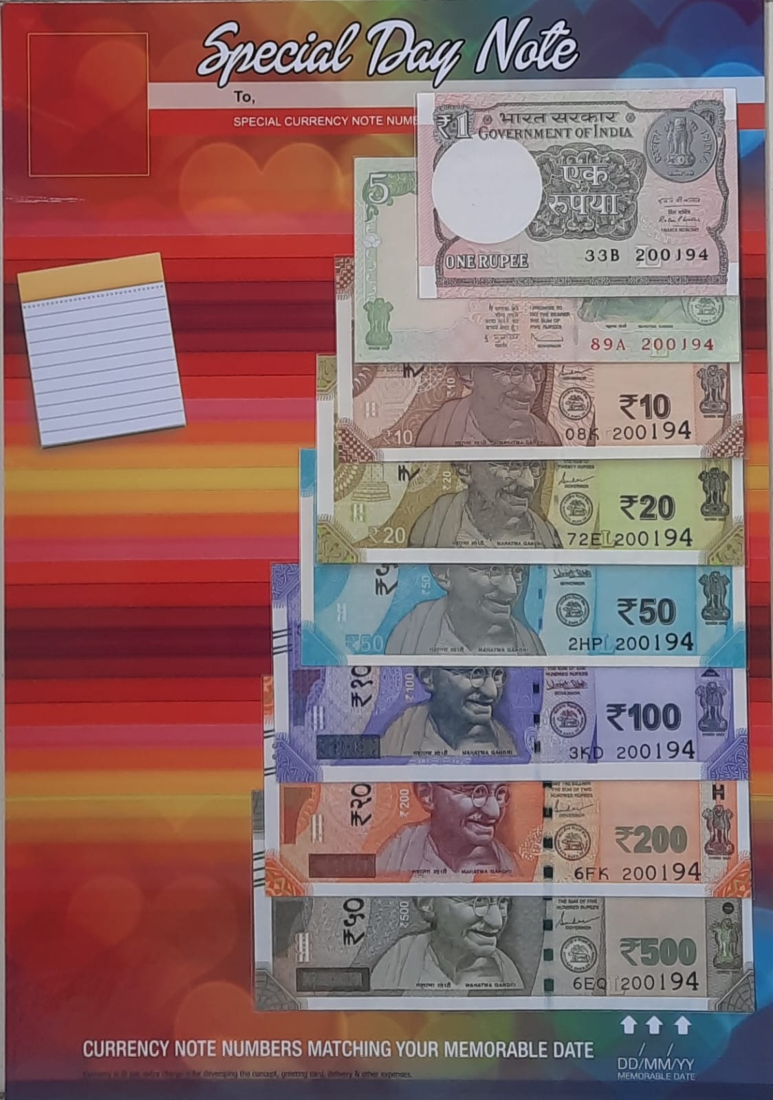 1 Rs(New),5 Rs,10 Rs,20 Rs,50 Rs,100 Rs,200 Rs,500 Rs special date with currency note numbers matching your memorable dates in DDMMYY formet.its value for money.special day cardscan be given on any occasions like shop opening,1st meeting,retirement dates or any other occasion which is special for you.