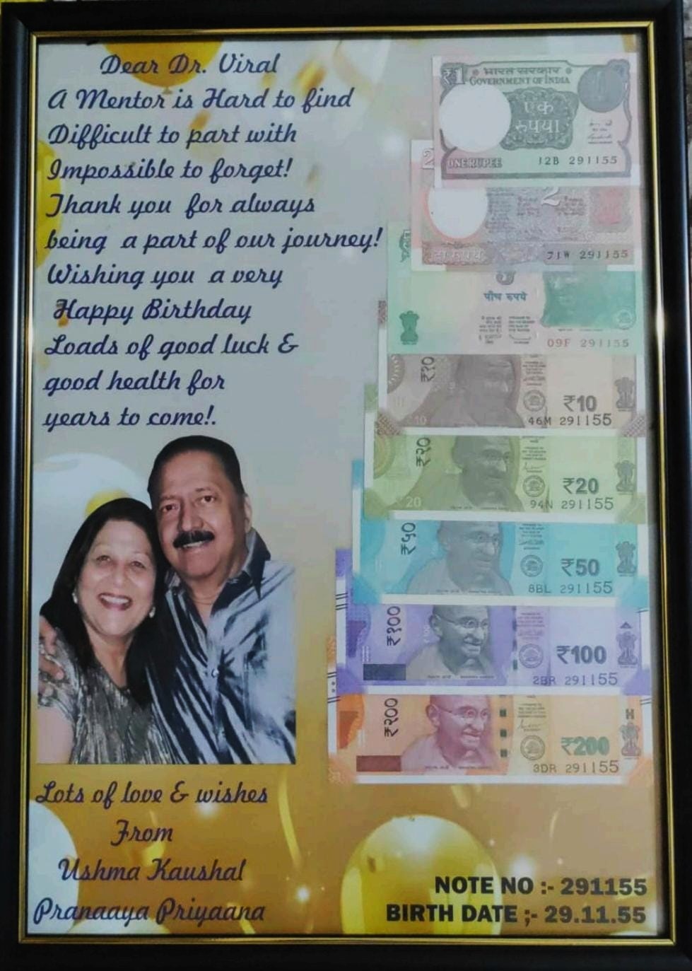 1 Rs(New) to 200 Rs birthdate with currency note numbers matching your memorable dates in DDMMYY format. Economical & affordable unique gift.