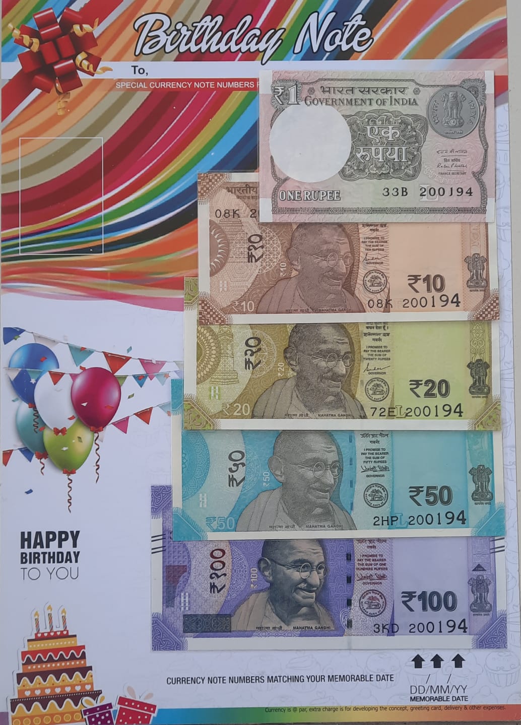 1 Rs(New).10 Rs,20 Rs,50 Rs,100 Rs birthdate with currency note numbers matching your memorable dates in DDMMYY format. Economical & affordable unique gift.
