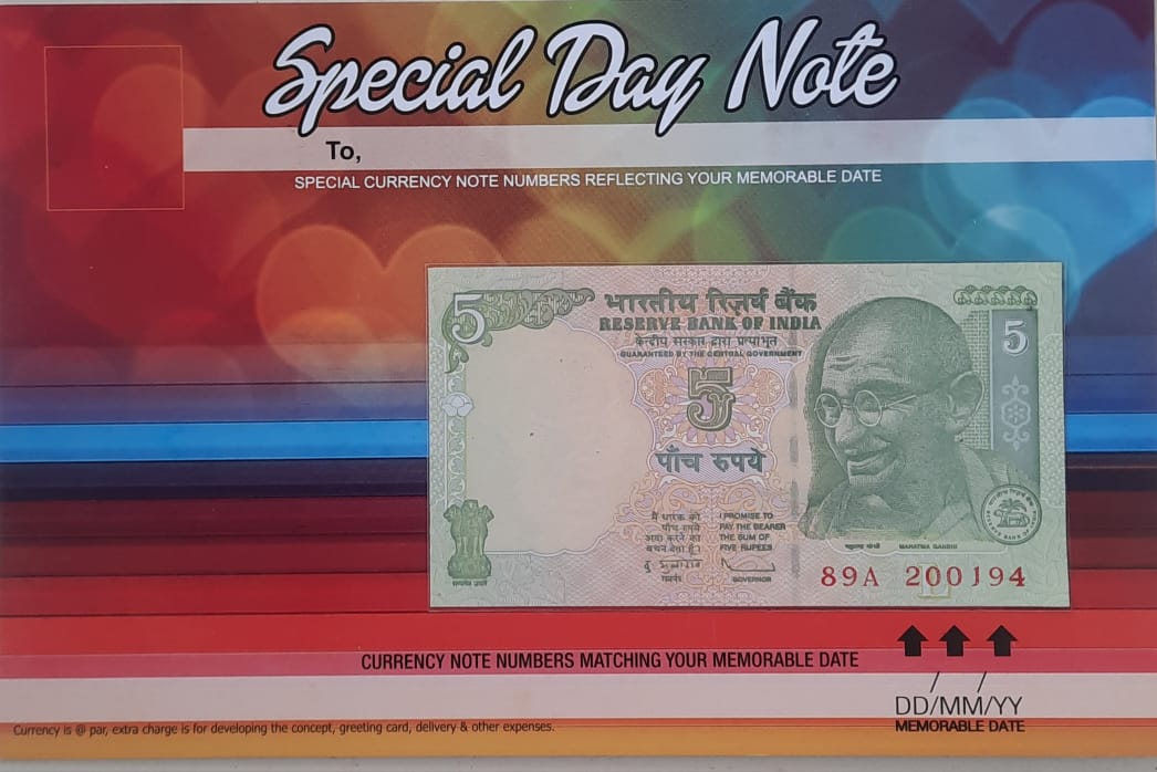 5 Rs special date with currency note numbers matching your memorable dates in DDMMYY formet.Economical & affordable unique gift.its value for money.special day cardscan be given on any occasions like shop opening,1st meeting,retirement dates or any other occasion which is special for you.